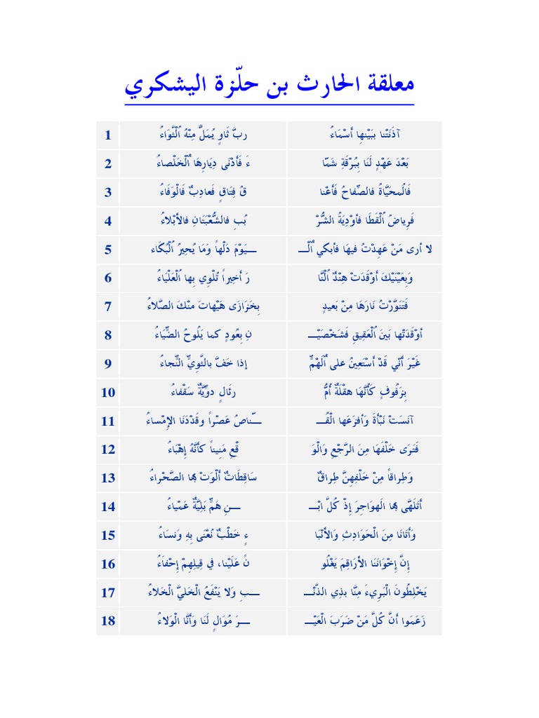 منصور البلوشي On Twitter 3 الحارث بن حلزة الاسم الحارث بن حلزة اليشكري المولد العراق المعلقة آذ ن ـتــن ـا ب ــب ــيــنــهــا أ ســم ــــاء ر ب ث ـــاو ي ــم ـل م ــنــه الث ــواء ب ـعــد ع ـهــد ل ـنـا ب ب ـرق ـة ش م ــاء