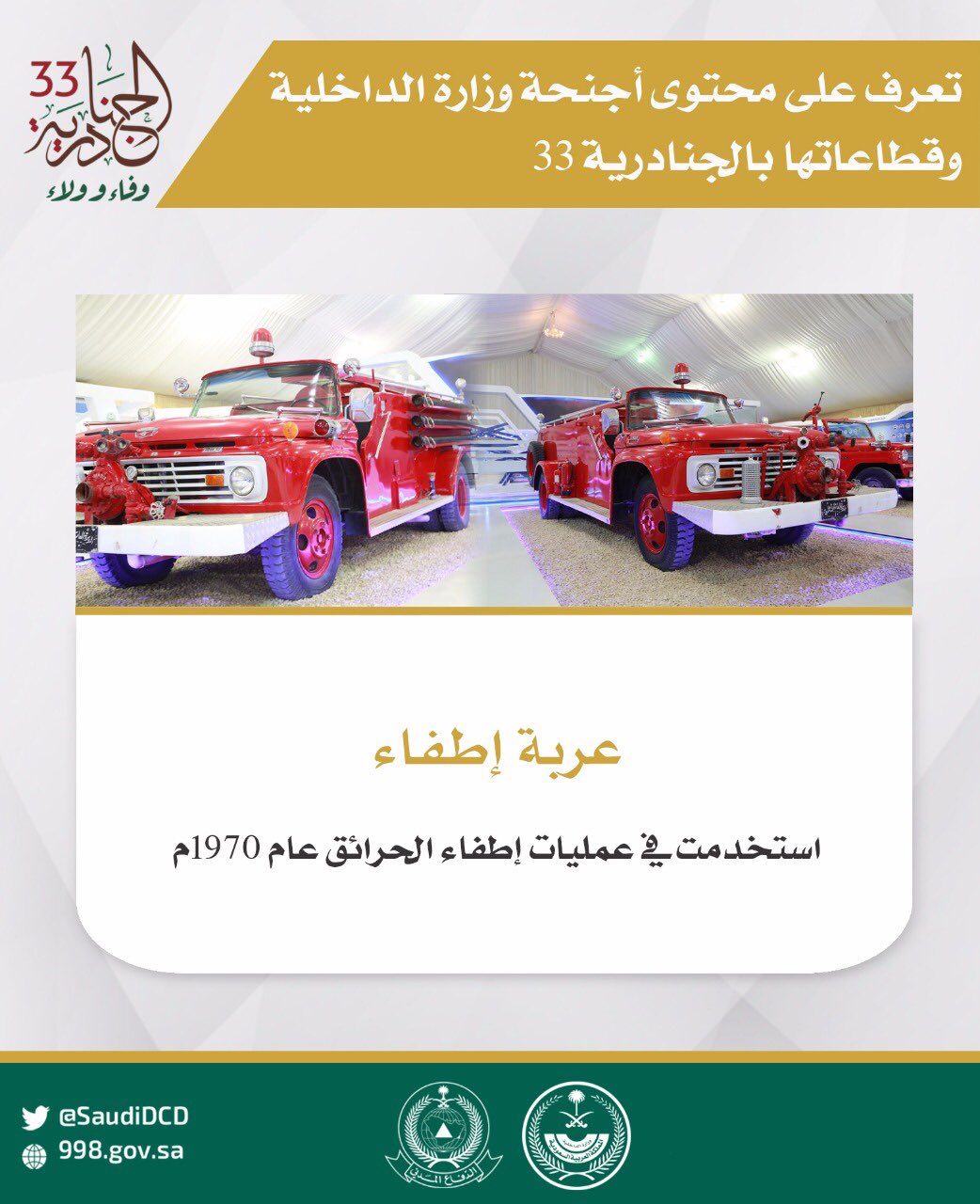 الدفاع المدني السعودي Ar Twitter تعرف على عربات الإطفاء قديما في معرضنا بـ الجنادرية 33 الجنادرية وفاء وولاء