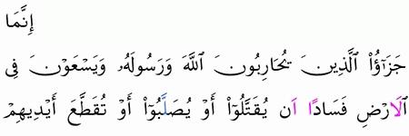 إ ن م ا ج ز اء ال ذ ين ي ح ار ب ون الل ه و ر س ول ه و ي س ع و ن ف ي ال أ ر ض ف س اد ا أ ن ي ق ت ل وا أ و ي ص ل ب وا أ و ت ق ط ع أ ي د يه م و أ ر ج ل ه م م ن خ ل اف أ و ي ن ف و ا م ن ال أ ر ض ذ ل ك ل ه م خ ز ي ف ي الد ن ي ا