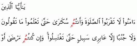 الآية ي ا أ ي ه ا ال ذ ين آم ن وا ل ا ت ق ر ب وا الص ل اة و أ نت م س ك ار ى ح ت ى ت ع ل م وا م ا ت ق ول ون و ل ا ج ن ب ا إ ل ا ع اب ر ي س ب يل Islam